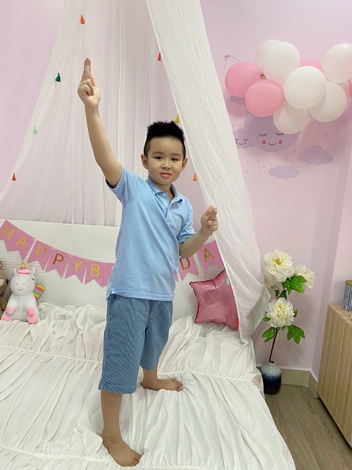Vy Oanh chia sẻ “Cậu cả vào lớp 1 mà không được tựu trường. Sáng nay khi các em còn đang say ngủ thì anh 2 đã tự giác dậy học online, không cần ai nhắc, thương lắm! Voi học hệ 13 năm theo chương trình của Anh, lớp 1 chưa biết đọc, biết viết nên ba hoặc mẹ cũng phải theo sát anh Voi, thế là 2 cụ thân sinh này thêm việc vào mùa dịch”