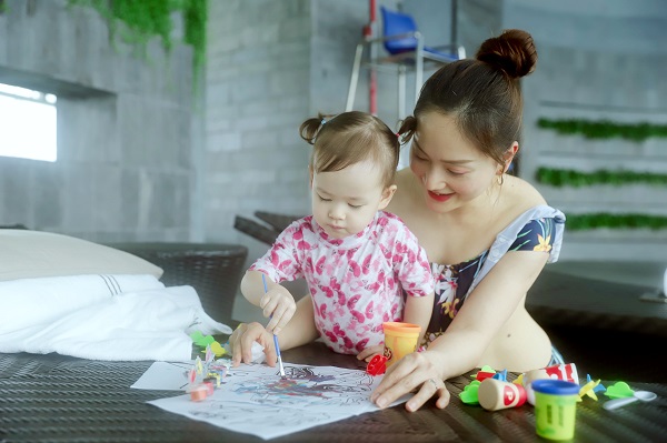 Line tuy còn bé nhưng tỏ ra khá dạn dĩ khi xuống hồ, cô bé thích thú đùa nghịch cùng mẹ trong làn nước mát. Tranh thủ những lúc vui chơi cùng con, Lan Phương sẽ dạy cho bé thêm về những kiến thức nhỏ xung quanh. Nữ diễn viên mong muốn mình không chỉ là mẹ mà sẽ như một người bạn đồng hành trong quá trình trưởng thành của con gái.