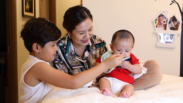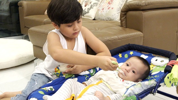 Tapchisaoviet - 2 nhóc tì nhà Thanh Thúy – Đức Thịnh khiến fan hâm mộ thích thú khi chính bé Cà Phê – con trai lớn của cặp đôi nhà sản xuất phim “Trạng Quỳnh” – đã tự tay đút cho em của mình những muỗng ăn dặm đầu tiên.