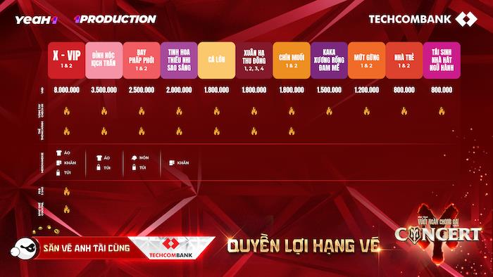 Nhóm vé VIP: X-VIP 1,2 (8.000.000 đồng/vé). Riêng loại vé này sẽ mở bán theo hình thức combo 10 vé. |