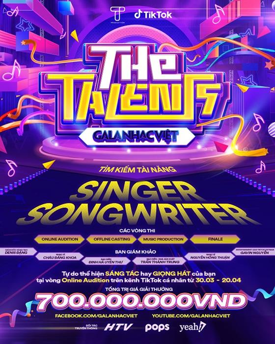 The Talents Gala Nhạc Việt với vòng thi Online Audition bắt đầu từ ngày 30/03 – 20/04. Sau đó Top 20 thí sinh với điểm số chuyên môn và lượt xem cao bước vào Offline Casting để gặp gỡ và trình diễn trực tiếp trước Ban Giám Khảo. Top 3 thí sinh xuất sắc sẽ được đầu tư thực hiện Music Video để thể hiện tài năng và chọn ra người chiến thắng.