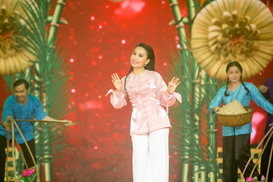 Nữ ca sĩ Cẩm Ly duyên dáng mặc áo bà ba thể hiện ca khúc Mười thương miền Tây, tái hiện khung cảnh đón Tết miền Nam đặc sắc, mộc mạc và gần gũi
