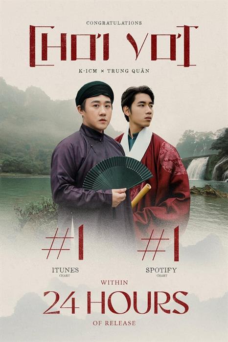 Tintuc - 1 ngày sau khi K-ICM ra mắt MV Chơi Vơi kết hợp cùng “thánh mưa” Trung Quân, ca khúc đã gặt hái loạt thành tích ấn tượng trên các nền tảng nhạc số quốc tế khi đồng thời nắm giữ vị trí Quán quân của BXH Spotify lẫn iTunes Việt Nam. Sản phẩm âm nhạc mới nhất của K-ICM ngập tràn trong “cơn mưa” lời khen từ công chúng từ phần âm nhạc cho đến phần hình ảnh.