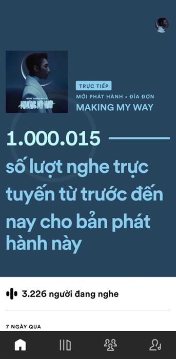 Tại mặt trận Spotify, đúng 10h25 sáng nay, Making My Way của Sơn Tùng M-TP chính thức chạm mốc 1.000.000 lượt stream đầu và con số đang tăng mạnh mẽ từng phút. Và đây cũng là lượng stream nhạc vô cùng ấn tượng đối với một ca khúc 100% tiếng Anh được nghe trong hơn 24 giờ đầu phát hành của nền tảng này.