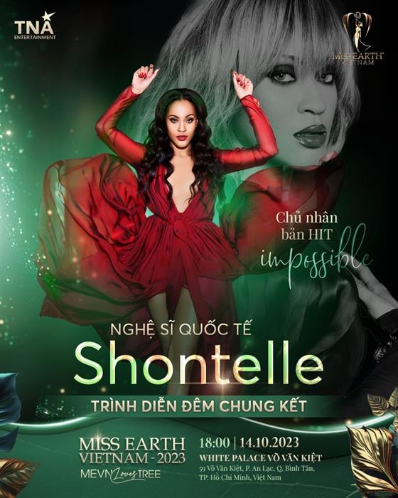 Vào tối ngày 14/10/2023 tới đây, ngôi sao ca nhạc hàng đầu thế giới – Shontelle sẽ có những màn biểu diễn khuấy đảo đêm chung kết Miss Earth Việt Nam 2023 ngay trên sân khấu của cuộc thi được tổ chức tại White Palace Võ Văn Kiệt (Quận Bình Tân, TP.HCM).