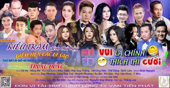Tintuc - “Kiều Trâm đêm thứ bảy” tái ngộ khán giả Sài Thành với đêm nhạc “Vui là chính – Thích thì cười” với sự quy tụ của nhiều danh hài đình đám, hứa hẹn mang đến cho khán giả rất nhiều bất ngờ và hấp dẫn.