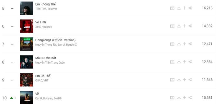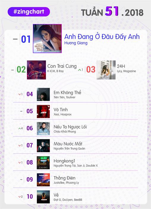 Top 10 #zingchart tuần này không có nhiều biến động, ngoại trừ sự thăng hạng của 24H và Nếu ta ngược lối. Ca khúc của Châu Khải Phong có cú nhảy 4 bậc để tiến lên hạng 6. Bản tình ca của bộ đôi LyLy và Magazine chiếm giữ hạng 3 tuần này. Trên #zingchart real-time, 24H đã vươn lên hạng 2 và đe dọa soán ngôi vương của Anh đang ở đâu đấy anh.