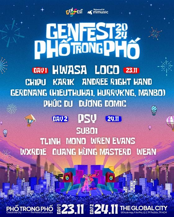 Vào ngày đầu tiên tổ chức – 24/11, lineup của GENfest gồm Hwasa, Loco, Chi Pu, Karik, Andree Right Hand, nhóm GERDNANG – HIEUTHUHAI, HURRYKNG, MANBO, Phúc Du, Dương Domic. Tới ngày thứ hai tổ chức – 25/11, lineup GENfest sẽ có PSY, Suboi, tlinh, MONO, Wren Evans, WXRDIE, Quang Hùng MasterD, WEAN.