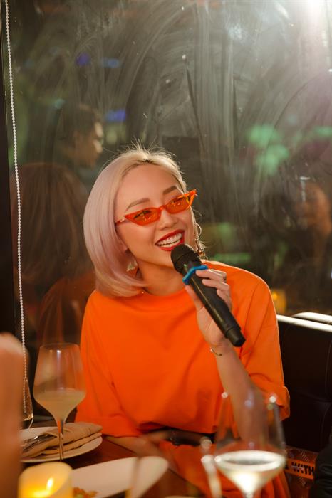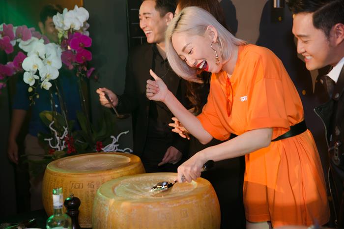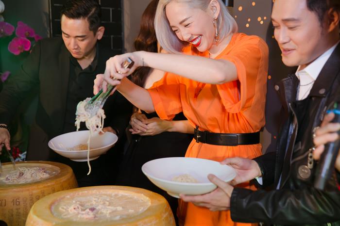 Và chính giây phút thư giãn của mình, Tóc Tiên đã có những hẹn hò cùng bạn bè, đồng nghiệp đi ăn món Ý hương vị Nhật. Riêng với ca sĩ Quang Vinh, Tóc Tiên từng hẹn hò ăn tối nhiều lần với Quang Vinh nhưng đây là lần đầu tiên cô cùng anh ăn món Ý. “Tiên và anh Vinh từng ăn món Nhật cùng nhau, bởi hai anh em đều thích ẩm thực Á, Âu, nhưng trong xu hướng ẩm thực fusion (dung hợp) thì món Âu thuần như Ý kết hợp món Á thuần như của Nhật Tiên nghĩ đó là một điều thú vị. Đôi khi gia vị Âu hơi ngấy so với khẩu vị người Việt thì việc chọn thêm thắt gia vị Nhật sẽ hợp hơn khẩu vị người Việt mình”, Tóc Tiên nói.
