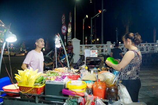Tiếp theo đó, hai nghệ sĩ ghé ăn thử món bánh mì Trường Tiền, chỉ một xe bán nhỏ nhưng có rất nhiều người xếp hàng để mua thưởng thức. Ở đây họ mua một ổ bánh mì thập cẩm chia đôi, kèm sữa đậu. Khánh Vân gật gù tâm đắc: “Đủ vị 3 miền trong bánh mì luôn, phải nói là ngon!”