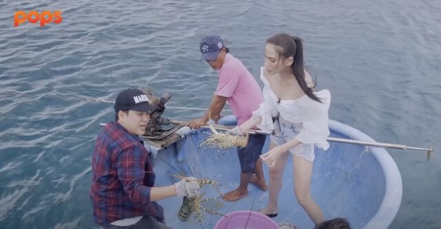 Võ Hoàng Yến đã lần đầu tự mình đi thuyền thúng ra tận bè bắt tôm hùm, con nào con nấy phải nặng vài cân.