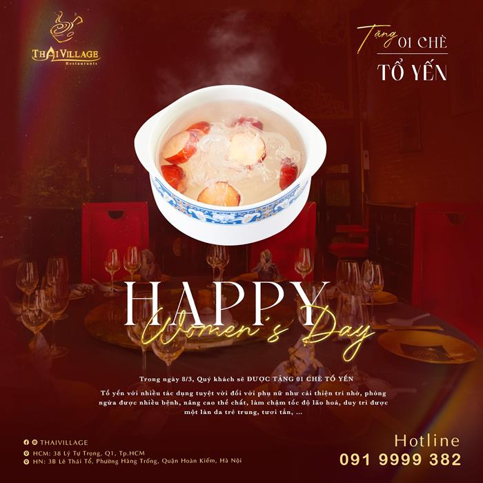 Dịp lễ này, đến Thai Village sẽ ĐƯỢC TẶNG 01 CHÈ TỔ YẾN. Nhà hàng thường xuyên có chương trình khuyến mại hấp dẫn đặc biệt vào các dịp lễ, Tết.
