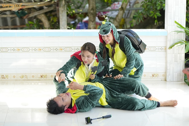 Vừa đặt chân lên đảo, cả ba đã gặp ngay thử thách khó nhằn từ chương trình, nhận liền hình phạt hóa thân thành “cá sấu” và đi bộ khắp đảo để tìm kiếm gia đình mà Sáng Nay Ăn Gì? sẽ ghé thăm trong chuyến đi này. Mặc bộ đồ “cá sấu” khá dày và đi bộ dưới trời nắng nóng cũng hơi khó khăn, Dương Lâm nhanh trí “mượn tạm” xe đạp của người dân bên đường để di chuyển nhanh lẹ và thuận lợi hơn. Lần lượt Khả Như, Tiểu Vy cũng bị “dạy hư” mượn trước trả sau; chọn cho mình chiếc xe phù hợp đậu bên đường. Tuy vậy, trang phục vướng víu cùng với lần đầu chạy xe lạ nên Tiểu Vy khá khó khăn trong việc điều khiển. Trong một phút chốc loạng choạng xém tông vào “chị hai Như” và “anh ba Lâm”. Dương Lâm cũng gian nan mới vượt qua thử thách khi gục ngã vì say nắng lúc vừa tìm được đến nhà của chủ hộ Chín Thơm. Nhưng bù lại, cả ba cuối cùng cũng tìm đến được đúng nơi và gặp gỡ gia đình khai hoang ấp đảo Thiềng Liềng – nhà ông Tám Thanh.