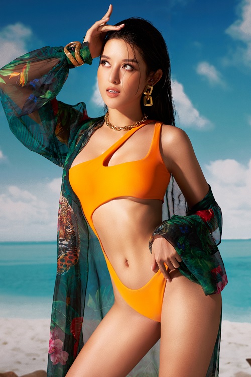 Huyền My diện bikini, tinh tế khoe dáng nuột nà cùng làn da rám nắng, khỏe khoắn. Trong bộ cánh rực rỡ màu cam, cô phô diễn cơ bụng săn chắc cùng đôi chân dài thẳng tắp. Người đẹp càng cuốn hút khi khoác hững hờ áo voan có họa tiết rừng nhiệt đới xanh mát. Cô khoe vầng trán cao, kết hợp biểu cảm tự tin, tạo dáng với đôi mắt “biết nói” gây xao xuyến. Diện thêm bộ phụ kiện ánh kim, á hậu tỏa sáng trong một diện mạo trẻ trung, năng động và không kém phần nóng bỏng.