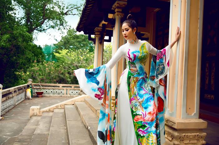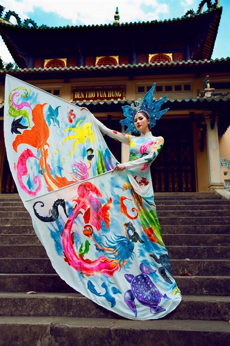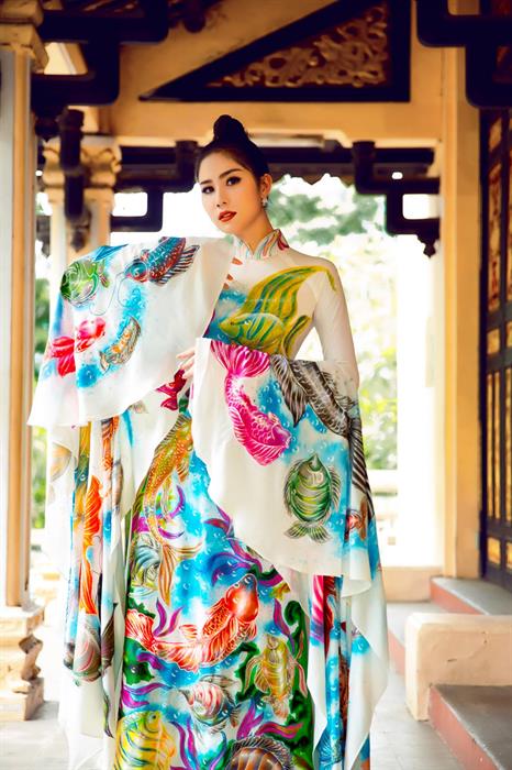 Ngoài thiết kế áo dài theo phom dáng truyền thống, BST lần này còn gây ấn tượng mạnh với thiết kế phần đuôi váy dài tạo hình đuôi cá lộng lẫy và quyền lực. Một thiết kế khác thì có điểm nhấn ở phần cánh tay dài với tạo hình xòe rộng như những đuôi cá lớn. Để tăng sự nổi bật và quyền uy cho bộ trang phục áo dài, NTK Tommy Nguyễn còn kỳ công sáng chế ra 1 chiếc vương miện độc lạ được đính kết từ nhiều viên pha lê tôn lên sự vương giả, xa hoa cho người mặc.