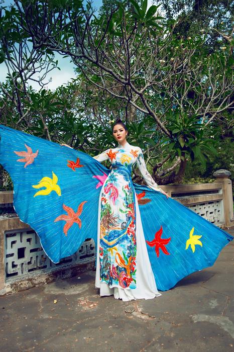 Với chiều cao 1m76 cùng gương mặt khả ái đậm chất Á đông, Hoàng Hạnh duyên dáng, thần thái quyền lực với những thiết kế áo dài đặc biệt. Kinh nghiệm từng chinh chiến 7 cuộc thi sắc đẹp lớn nhỏ, Hoàng Hạnh được khen về phong thái chụp ảnh rất chuyên nghiệp, thần thái uy nghi, quyền lực tôn lên vẻ đẹp cho áo dài. Lấy cảm hứng từ 'Đại dương xanh', tông màu chủ đạo của bộ sưu tập lần này là màu xanh nước biển, màu trắng. Trên nền vải lụa, NTK Tommy Nguyễn vẽ tay nhiều họa tiết là những loài sinh vật sống dưới biển như cá, tôm, ốc, san hô…tạo nên một không gian sinh động trên chiếc áo dài. Ngoài việc tôn lên vẻ đẹp cho người phụ nữ, NTK Tommy Nguyễn còn mong muốn hình ảnh chiếc áo dài của mình góp phần bảo vệ môi trường biển, ngừng xả rác thải xuống biển để các loài sinh vật được sống khỏe mạnh dưới nguồn nước sạch tươi mát.