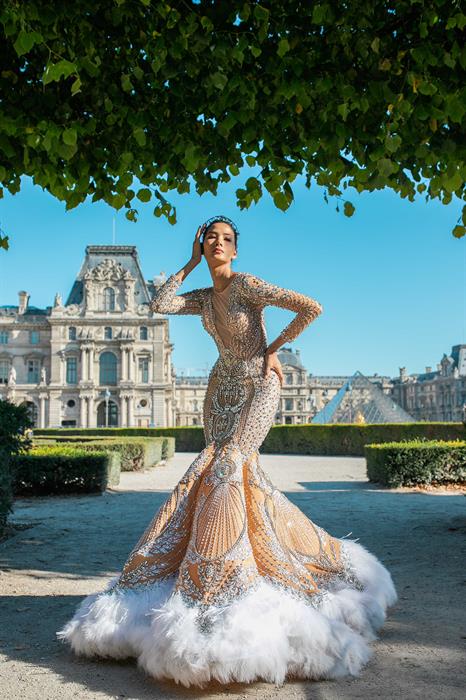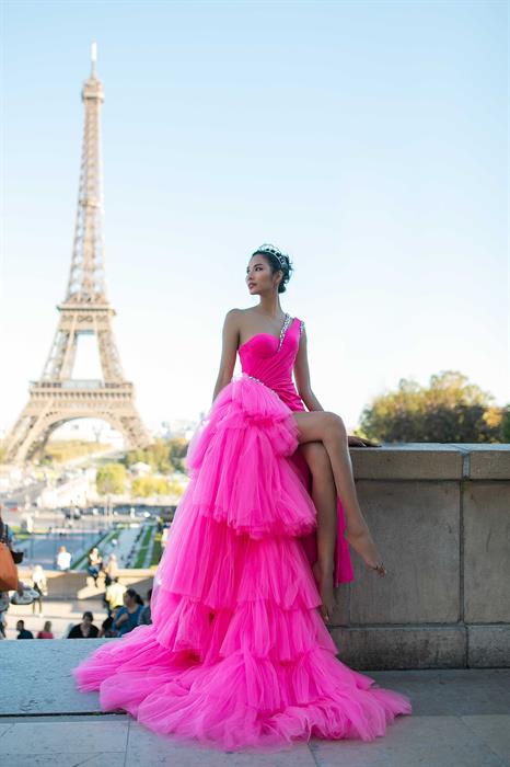 Cô quyết định lưu giữ tất cả cảm xúc ấy vào trong bộ ảnh, kết hợp cùng bộ sưu tập “Fairy in France” của nhà thiết kế Linh San. Với những thiết kế dạ hội mang phong cách gợi cảm, hiện đại, kiểu dáng ôm khít tôn đường cong cơ thể và vận dụng kỹ thuật xếp ly, đính đá tỉ mỉ, Á hậu Hoàng Thùy khéo léo khoe hình thể quyến rũ sau khi tăng 6kg. Bên cạnh đó, khi khoác lên người bộ áo dài họa tiết hoàng gia và chim bồ câu hòa bình, Á hậu Hoàng Thùy vô cùng dịu dàng đằm thắm giữa một Paris thơ mộng giàu chất thơ.