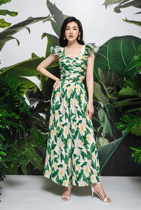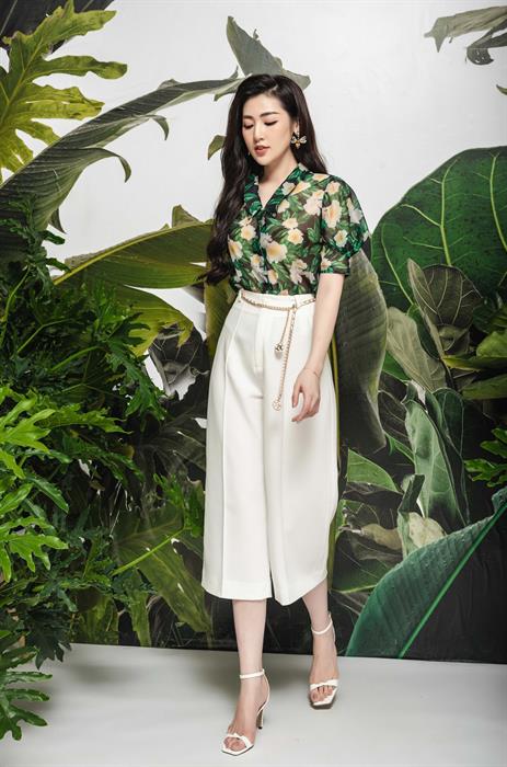 Chọn những thiết kế cho mùa Hè, Tú Anh luôn ưu tiên chọn áo croptop với phần xếp nếp ấn tượng ở ngực, phần tay bèo duyên dáng như chính loài hoa trà. Bên cạnh đó thì sự kết hợp của quần ống rộng kèm với áo với họa tiết hoa trà, nhẹ nhàng thanh thoát cũng khiến cô dành nhiều sự quan tâm.
