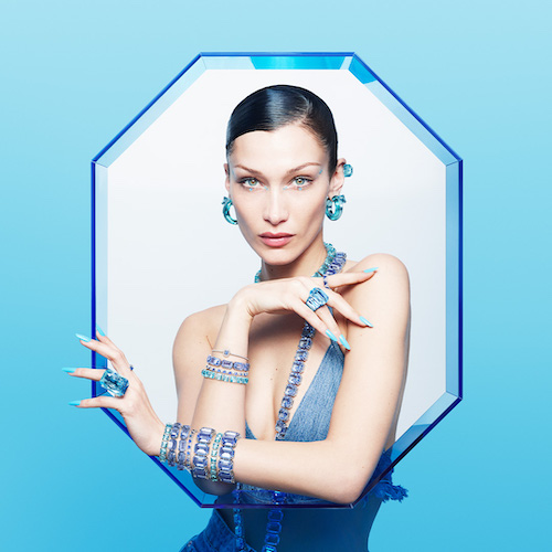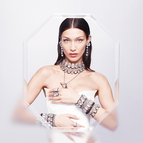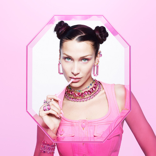 Bella trong phiên bản hồng sôi nổi và nữ tính với sắc hồng đá quý rực rõ để tạo nên vẻ ngoài ngọt ngào những vẫn đầy mạnh mẽ. Như sự đối lập với vẻ ngoài cá tính và táo bạo của mình, Bella Hadid đeo các thiết kế thuộc dòng Lucent như dây chuyền Millenia và Gema, hoa tai đinh tán của Orbita, tất cả được kết lại bằng những viên pha lê hình bát giác rực rỡ – đây như một món phụ kiện độc đáo cho các quý cô hiện đại.