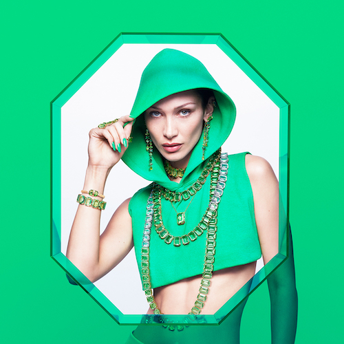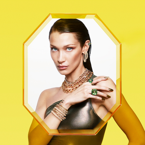 Bella thể hiện sự hào nhoáng đầy vui tươi của pha lê Swarovski qua sự lấp lánh của màu ánh kim và đá pavé. Bộ sưu tập này thể hiện niềm hân hoan của những ngày nghỉ được tắm mình trong ánh sáng mặt trời lung linh với những đường cắt hình học chuẩn xác của pha lê thuộc dòng Dextera Family. Bên cạnh đó, Bella Hadid còn đeo vòng cổ và vòng tay Millenia, vòng tay Dextera và nhẫn Numina theo phong cách layering độc đáo.