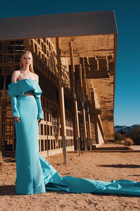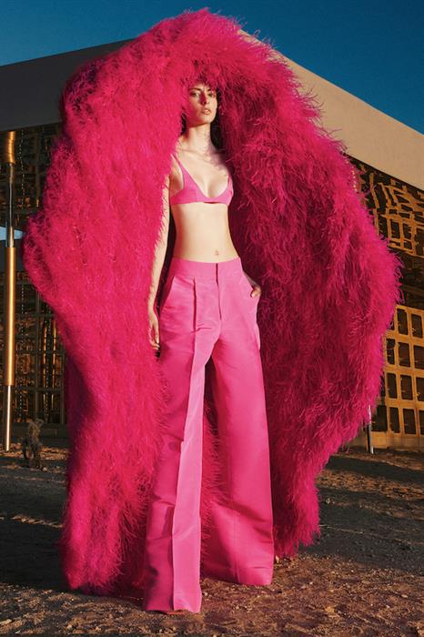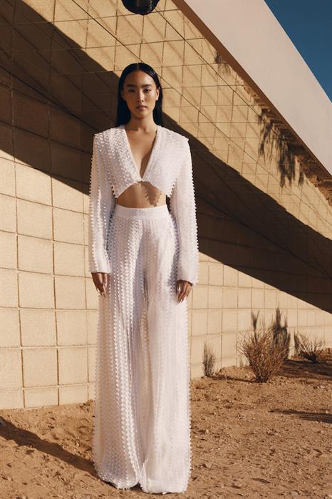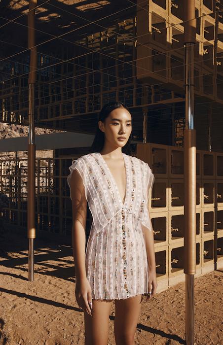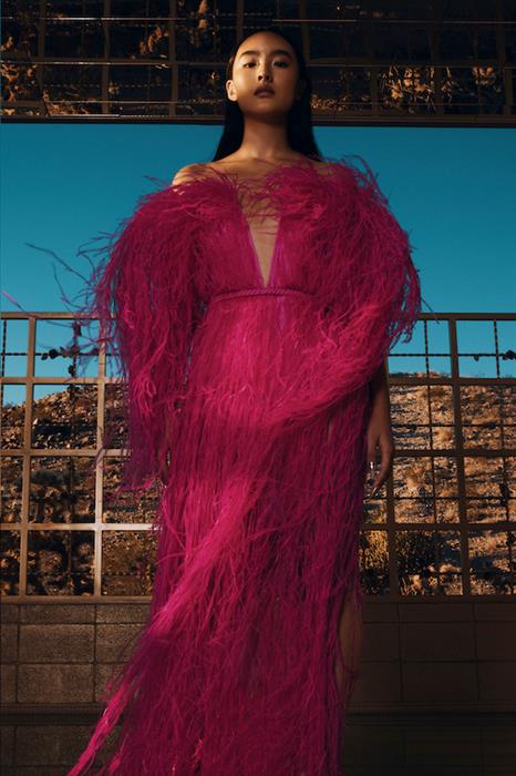 Vẻ đẹp rực rỡ của “cuộc hẹn” nơi hoang mạc hiện lên qua nhiều thiết kế lông đà điểu phấp phới trong nắng gió và đính đá màu lộng lẫy. Là crop top lông vũ màu trắng tôn bờ vai cùng vòng eo, đầm dạ hội cúp ngực màu hồng, mũ quá khổ thách thức độ chịu chơi của bất cứ tín đồ nào. Crop top dài tay đính pha lê lẫn sequin đi kèm quần cạp cao, suit phom rộng cuốn hút nhờ những hạt đá lấp lánh đính dày đặc khắp bề mặt vải. Nét kiêu hãnh và ấn tượng toát lên từ cách phối trang sức và phụ kiện statement gồm khuyên tai, vòng cổ đính đá, cài áo kim loại màu vàng và bạc bản lớn.