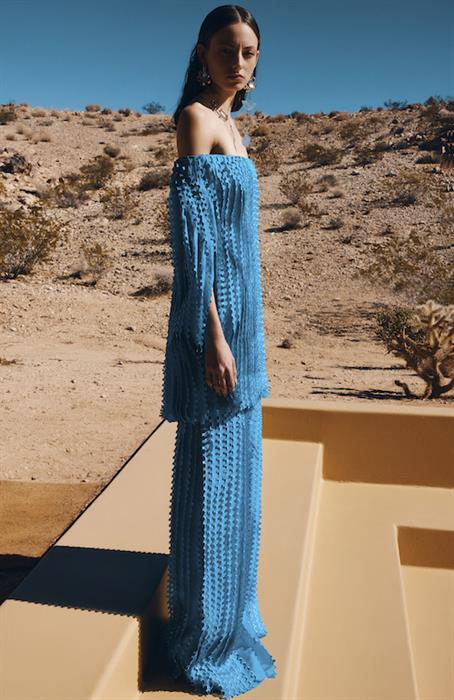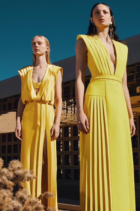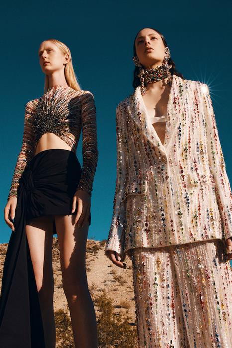 46 looks của mùa tới tập trung vào trang phục dự tiệc, toát lên vẻ đẹp nữ tính qua chi tiết khoe vai trần, những đường cut-out phóng khoáng ở eo, đường xẻ ngực sâu hay lưng váy cắt xéo. Trên bra top, crop top, chân váy dáng cột hay quần ống suông, nghệ thuật thủ công bậc thầy tiếp tục được khẳng định với kỹ thuật thêu hoạ tiết răng cưa độc quyền trên lụa organza, xếp nếp lặp lại tạo thành bề mặt mới và hiệu ứng gợn sóng khi di chuyển.