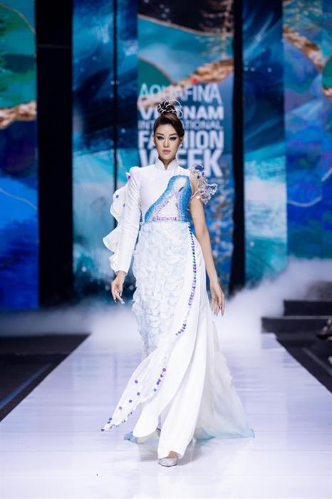 Khép lại màn trình diễn của Thương hiệu Phuonglly By Phương Hồ, Hoa hậu Khánh Vân bước ra lộng lẫy từ trong hiệu ứng ánh đèn mờ ảo. Cô sải bước tự tin với những cử chỉ tay uyển chuyển thanh thoát toát lên vẻ đẹp rạng ngời. Miss Universe Vietnam 2019 trong tà áo dài truyền thống màu trắng được cách điệu với lớp vải lấp lánh ánh xanh dương đã làm nổi bật lên thông điệp của BST “Cá chép hóa rồng”.