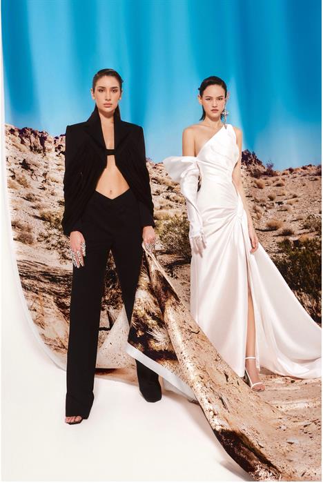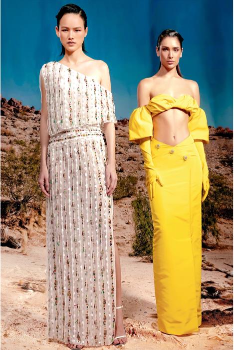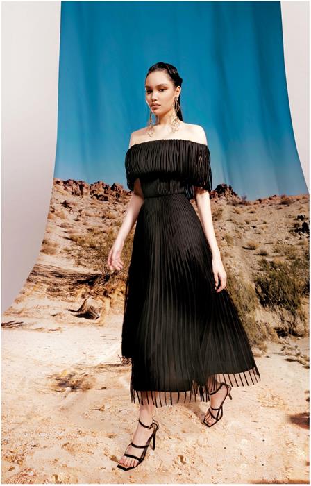 Hai tâm điểm khác của BST hội tụ trên những mẫu đầm dài chấm đất hoặc đầm ngắn ngang đùi với chất liệu vải đanh, mịn. Được tô điểm bởi kết cấu bất đối xứng trên áo trễ vai hoặc mẫu áo ngực nhỏ xíu khai thác tối đa hình thể người mặc nhưng không hề tạo cảm giác phô phang. Những nếp gấp thuận theo đường cong của cơ thể khiến chiếc áo bé tí trở nên mềm mại, quyến rũ và tinh tế. Một số mẫu đầm trở nên phá cách hơn khi đi kèm ống tay pha găng tay hai trong một.