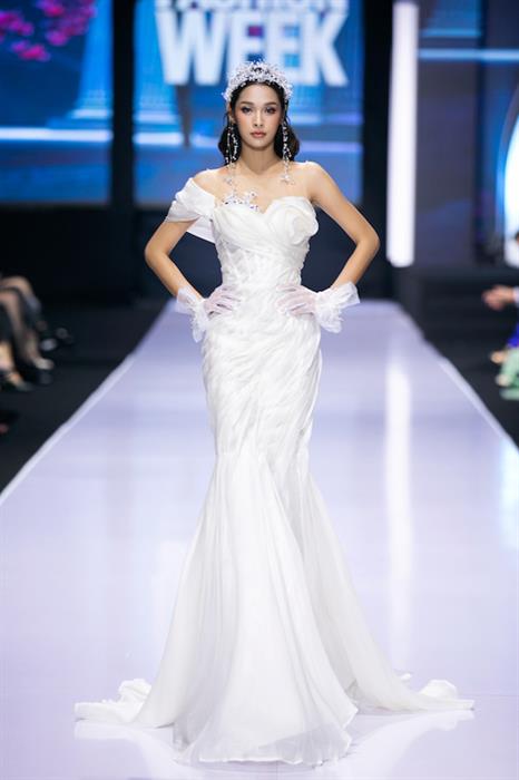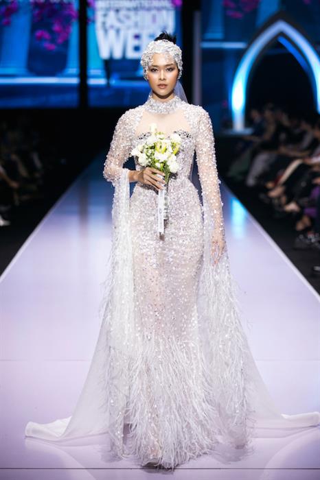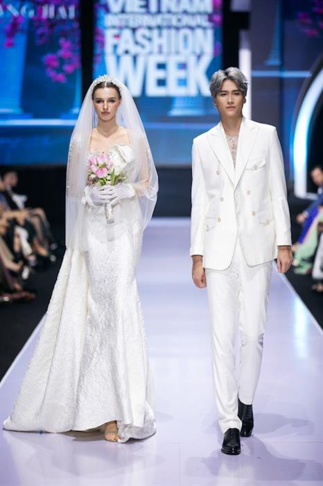 Nếu phần đầu BST “Em tôi”, “những nàng thơ” được khoác lên mình các thiết kế dạ hội ẩn chứa nhiều hình ảnh thiên nhiên, hoa cỏ với những kỹ thuật thêu tay, đính hạt cườm, hạt ngọc trai lấp lánh và tinh xảo thì ở phần hai, sàn diễn đã hoá thành một lễ đường qua những bộ váy cưới lộng lẫy. Diễn viên Diệp Bảo Ngọc đã mở đầu phần hai của BST “Em tôi” trong bộ váy cưới lấp lánh và kiêu sa.