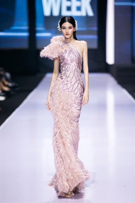 BST “Em tôi” được chia thành 2 phần trình diễn mang sắc thái hoàn toàn khác nhau. Mở đầu là màn catwalk của người mẫu nhí Bảo Hà cùng 2 mẫu nam mạnh mẽ, khoẻ khoắn. Cô nàng xuất hiện lộng lẫy trong thiết kế sang trọng, đan xen tông màu trắng chủ đạo cùng xanh và hồng tạo nên vẻ đẹp hài hoà khó tả. Cùng với dàn mẫu nam hỗ trợ, Bảo Hà trở thành “nữ thần rừng xanh” ngay trên sàn diễn Aquafina Tuần lễ Thời trang Quốc tế Việt Nam Thu Đông 2022.