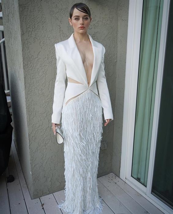 Để phần ngực bớt trống trải, Joey King đeo dây chuyền dáng dài hiệu Shaun Leane của Anh. Cô hoàn thiện phong cách với kiểu tóc ướt chải ép sát đầu, phần đuôi tóc uốn lượn điệu đà lấy cảm hứng từ phong cách làm đẹp của những năm 1920. Đôi mắt thêm phần cuốn hút nhờ những đường nét cách điệu bay bổng màu trắng ăn ý với bộ đầm.