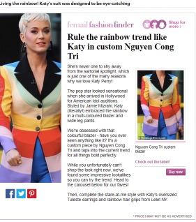 Từ hơn 6 năm đổ lại đây, cái tên Công Trí dần trở nên quen thuộc đối với giới mộ điệu thời trang quốc tế bởi ngoài những thành tựu nội địa Nhà “ Mốt” Công Trí còn là nhân tố Việt hiếm hoi được tán dương trên các chuyên trang uy tín, đồng thời lọt vào “mắt xanh” của giới siêu sao Hollywood như Adele, Miley Cyrus, Beyonce, Rihanna, Charlize Theron, Zendaya… Và tất nhiên không thể không kể đến Katy Perry. Mới đây nhất, giọng ca “Roar” đã quay trở lại ghế nóng American Idol mùa thứ 21 trong diện mạo vô cùng tươi mới thanh lịch đầy sexy. Không mấy ngạc nhiên khi Công Trí tiếp tục được cô cùng ekip “chọn mặt gửi vàng” cho lần tái xuất quan trọng này.
