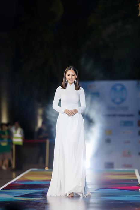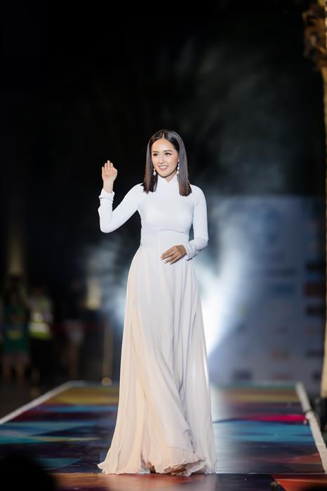 Hoa hậu nhận được tràng vỗ tay cổ vũ khi xuất hiện trên sàn catwalk với vai trò vedette trong bộ áo dài trắng tinh khôi.