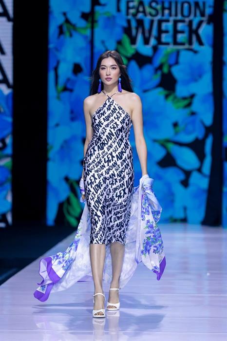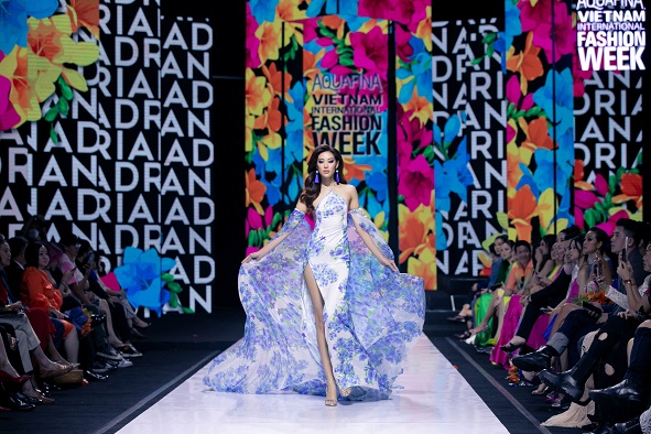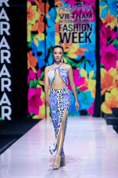 Chưa dừng lại ở đó, điều làm nên sức hút của BST “Lãng du” là sự xuất hiện của dàn Hoa hậu đình đám của showbiz Việt như Hoa hậu Khánh Vân, Á hậu Kim Duyên, Á hậu Lệ Hằng, Quán quân Siêu mẫu Châu Á (Supermodel Me) Quỳnh Anh,… cùng “đọ sắc” trong trang phục được thiết kế bởi NTK tài hoa Adrian Anh Tuấn. Trong BST này, Hoa hậu Khánh Vân đảm nhận vị trí vedette, thu hút trọn mọi ánh nhìn của khán giả với thần thái cực đỉnh và đường cong cuốn hút. Nàng vedette của NTK Adrian Anh Tuấn diện chiếc đầm voan mỏng với đường cut out quyến rũ kết hợp tà áo thướt tha khiến người xem không thể rời mắt. Bên cạnh đó, Á hậu Kim Duyên được NTK Adrian Anh Tuấn “chọn mặt gửi vàng” cho vị trí mở màn của show diễn. Sải bước đầu tiên trong màn trình diễn, cô nàng khiến ai nấy đều phải trầm trồ vì nhan sắc cực phẩm cùng body nóng bỏng.
