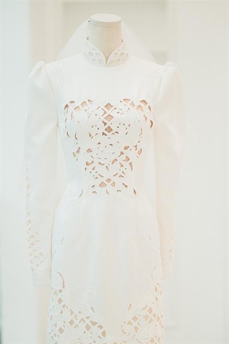 Bộ áo dài của Minh Hằng trong lễ gia tiên còn được biến tấu trên nền vải sateen trắng tạo nên họa tiết cực kì tinh xảo và không kém phần thanh lịch. Riêng nghệ thuật điêu khắc ren handmade trên chiếc áo dài, toàn bộ hoa văn đậm nét châu Âu được thiết kế hoàn toàn độc quyền phù hợp với dáng người của Minh Hằng.