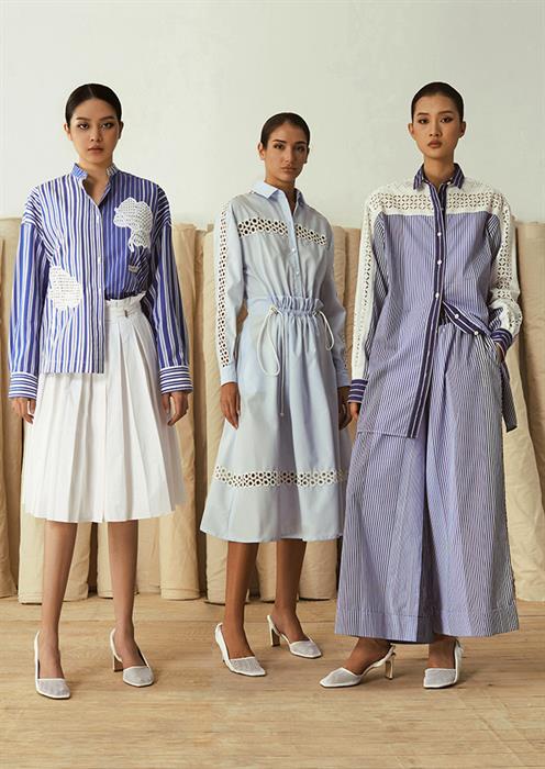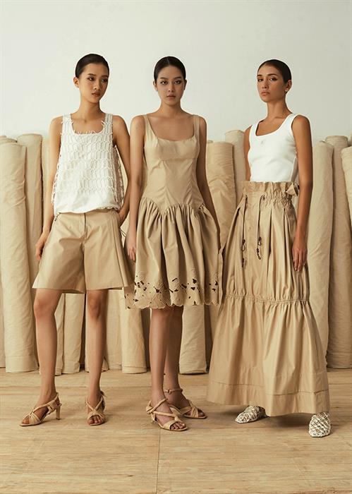 Nhà thiết kế cũng tiết chế họa tiết, tập trung hướng đến tinh thần tối giản. Dù vậy, trang phục không hề đơn điệu nhờ những chi tiết xẻ vai, những cánh tay áo được thổi phồng và xếp bèo, uốn lượn nhẹ nhàng như những cánh hoa xòe đang ở độ còn e ấp gợi mở nhiều mong đợi. Một vài bộ trang phục gồm sơ mi và quần shorts gây ấn tượng với cách sử dụng họa tiết kẻ sọc đứng riêng hoặc đi cùng ren trắng. Một số bộ khác lôi cuốn từ ánh nhìn đầu tiên với hình ảnh hoa lá được tạo nên từ kỹ thuật cắt laser tinh xảo trên áo blouse hay chân váy bút chì. Mốt mặc bra như trang phục thường từng được người anh cả của làng mốt Việt lăng xê từ bộ sưu tập "Cuộc hẹn rực rỡ", nay tiếp tục được lăng xê với cách kết hợp táo bạo giữa áo ngực và quần culottes màu be trên chất liệu kaki cao cấp.
