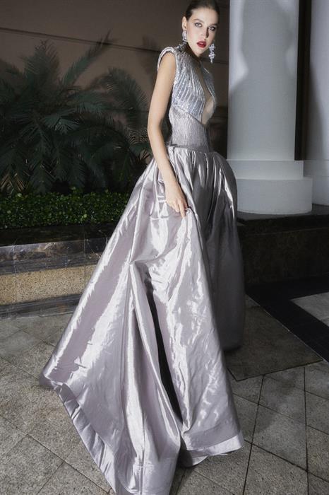 Thông qua cách kết hợp khéo léo giữa phom áo blazer cùng chân váy trụ đính kim sa, mẫu thiết kế số 39 thể hiện sự hoà hợp giữa vẻ đẹp mạnh mẽ cùng nét bay bổng nữ tính của người phụ nữ hiện đại.
