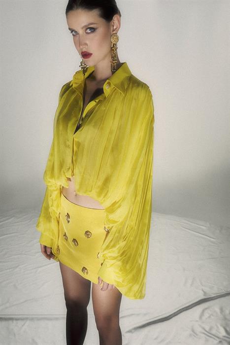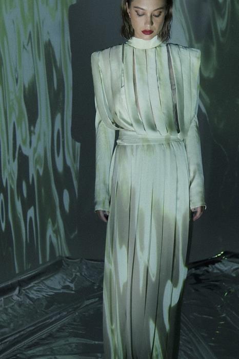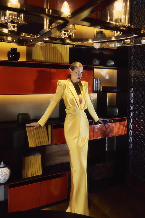 Một thiết kế được tạo ra từ kĩ thuật bias-cut thể hiện kĩ nghệ của những nghệ nhân tại xưởng CONG TRI. Mẫu thiết kế màu vàng thanh lịch và tao nhã, được làm từ chất liệu double satin. Điểm đặc biệt nằm tại chi tiết eo, thay vì chiết eo tạo đường cong, CONG TRI sáng tạo những nếp đổ gợi lên sự phóng khoáng, khác biệt.