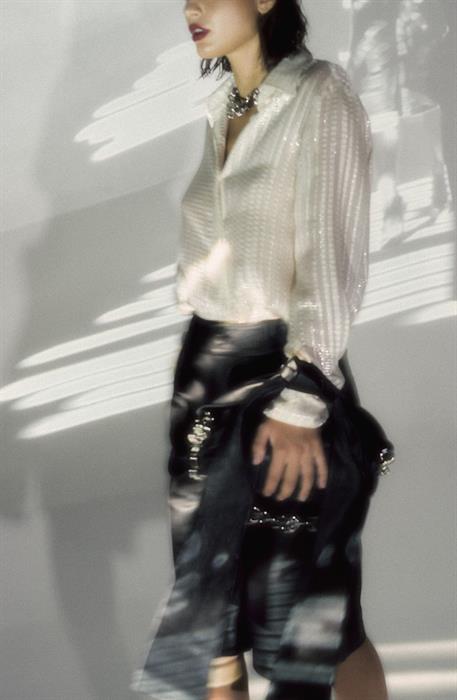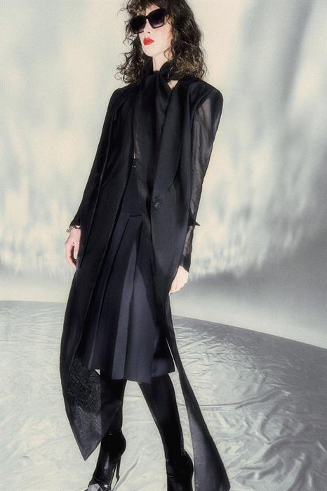 Đồng thời, trạng thái của người phụ nữ – trung tâm ý tưởng thiết kế – được sắp đặt khéo léo thông qua cách CONG TRI đặt để vị trí xuất hiện của các nhóm chất liệu. Sự tương phản trong việc sử dụng các chất liệu tơ mỏng nhẹ để dựng phom vải suit, vừa cho thấy kĩ thuật tinh xảo thương hiệu, đồng thời gửi gắm thông điệp về sự cân bằng giữ tính nam và nữ của những quý cô đương đại.