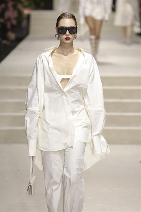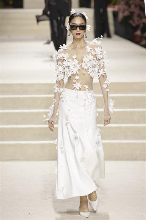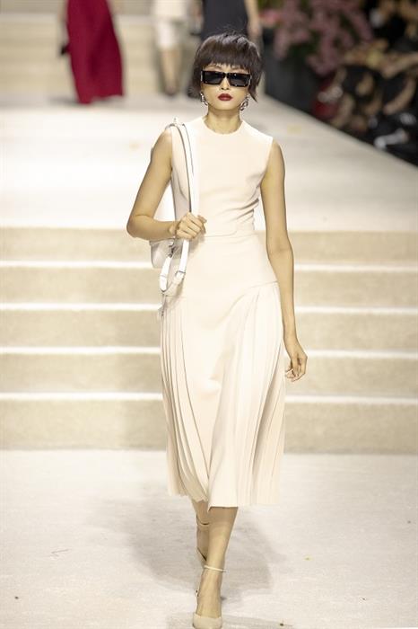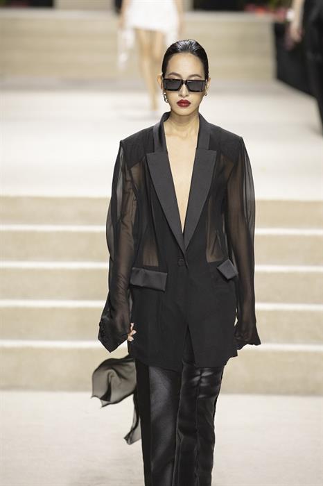 Show diễn mở màn với những gam màu sự hòa hợp giữa thời trang cao cấp lẫn tính ứng dụng như: đen, trắng hay beige,… trong một loạt các thiết kế mang hơi hướng hiện đại, làm nổi bật bản lĩnh mạnh mẽ, không khoan nhượng của một quý cô thế kỷ 21. Trong đó, phom dáng “chiếm sóng” nhiều nhất chính là các mẫu áo croptop cùng mini dress, tưởng chừng như thoải mái nhưng lại táo bạo bất ngờ với đường cắt xẻ khu chân ngực. Hình ảnh những chiếc áo quần xuyên thấu mỏng tang, short ngắn kết hoa 3D hay chiếc áo quá khổ và những chiếc quần dài cạp trễ mang đậm tinh thần quyết liệt, gợi cảm tột cùng nhưng vẫn phảng phất nét trang nhã trong mỗi DNA thương hiệu.
