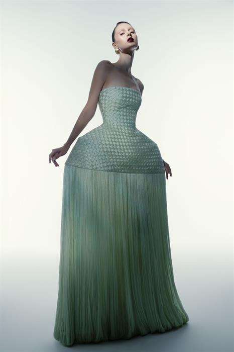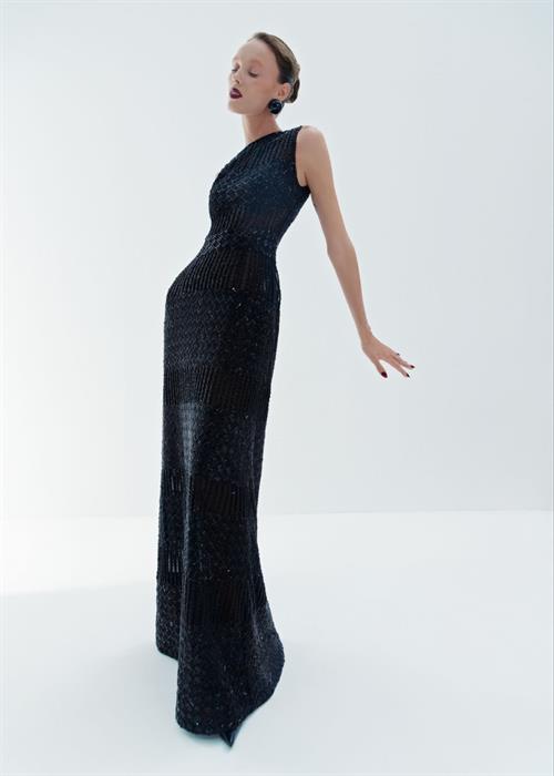 Thiết kế eveningwear kết hợp giữa kĩ thuật đan nong mốt và đính kết thuộc look #22 của BST Thu Đông 2025.