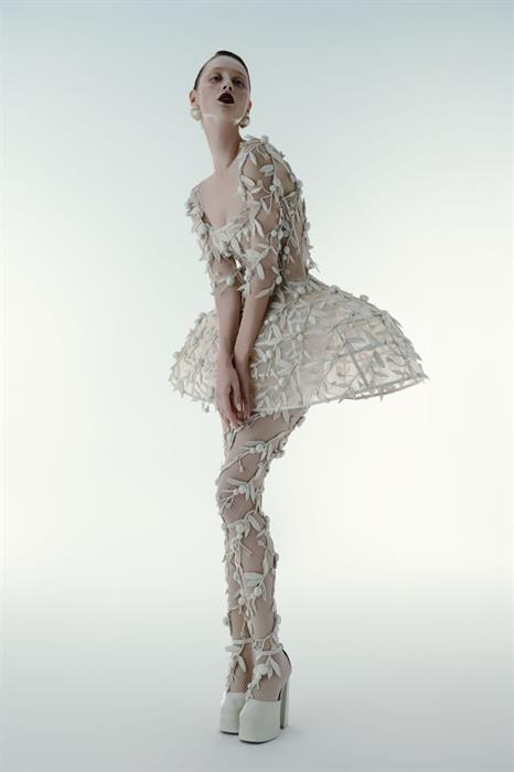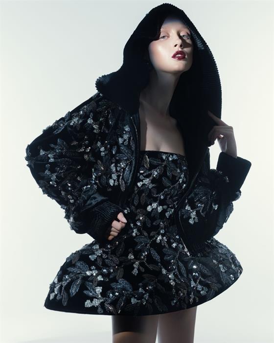 NTK Nguyễn Công Trí tiếp tục thể hiện sự đa dạng qua cách mix & match, mang đến một hơi thở hiện đại. Thiết kế look #11 thuộc BST Thu Đông 2025 tôn vinh đường cong đầy quyến rũ của người phụ nữ được xử lý qua chất liệu xuyên thấu tạo nên vẻ đẹp đầy tinh tế.