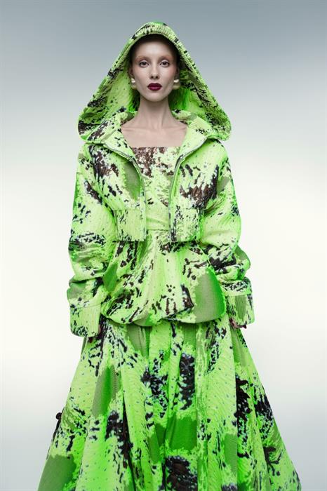 Nhà mốt CONG TRI khai thác tối đa tiềm năng của các chất liệu trong BST Thu Đông 2025. Lãnh Mỹ A được xử lý độc đáo với kỹ thuật chạy dây quen thuộc đã xuất hiện xuyên suốt trong các BST trước đó, tạo nên bề mặt mới mẻ nhưng vẫn giữ vững tinh thần của nhà mốt. Bên cạnh đó, silk chiffon bay bổng, vegan leather cá tính, jacquard xanh neon rực rỡ và taffeta sắc sảo đan xen giúp đa dạng hóa trải nghiệm thị giác.