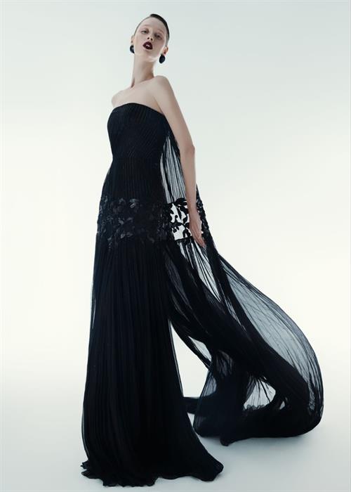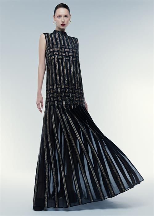 Thiết kế eveningwear đính kết cầu kì trên nền vải xuyên thấu dáng trụ mang đến vẻ đẹp thanh lịch và gợi cảm.