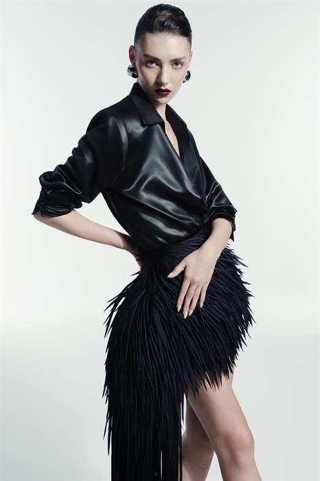 Thiết kế áo sơ mi Lãnh Mỹ A và chân váy tua rua được làm hàng trăm giờ trong BST Thu Đông 2025.