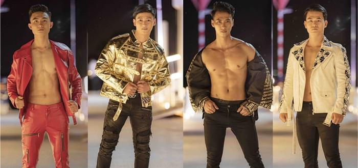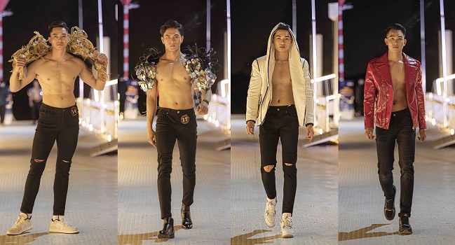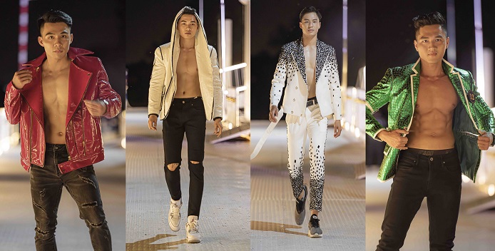 Có vẻ nhà thiết kế Tạ Nguyên Phúc khá ưu ái mọi thiết kế dành cho các thí sinh nam vì với những chiếc áo khoác hờ, các chàng trai có cơ hội dễ dàng khoe hình thể của mình một cách đẹp mắt và ấn tượng dưới ánh sáng huyền ảo của màn đêm.
