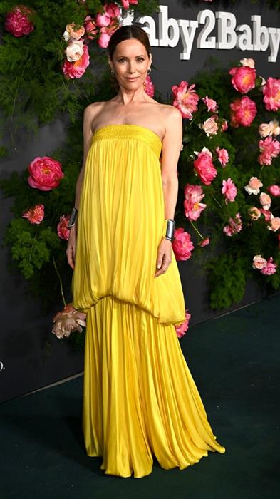 Cùng tháng, Leslie Mann khoe bờ vai trần quyến rũ với đầm vàng quây ngực của Công Trí tại Baby2Baby Gala ở Los Angeles hôm 12/11. Thiết kế được xử lý trên nền lụa cao cấp với chi tiết nhún xếp ly cách điệu. Để tăng vẻ mạnh mẽ, Leslie phối đầm cùng vòng tay chiến binh bằng bạc.