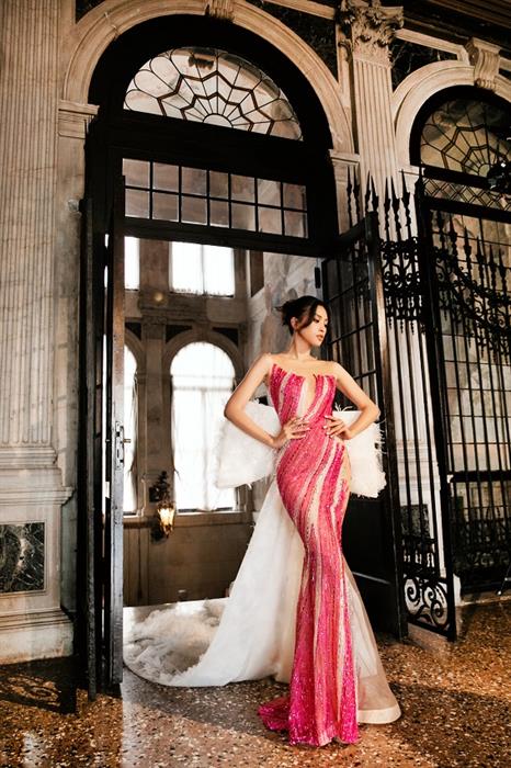 Đảm nhận vị trí vedette của BST váy dạ hội, Hoa hậu Trần Tiểu Vy được nhận xét vô cùng xinh đẹp, lộng lẫy. Đến với “Giao Hoà – Armonia”, Tiểu Vy còn mang một sứ mệnh đặc biệt khác – đại sứ Menard Collagen Gold – sản phẩm collagen nội sinh của thương hiệu mỹ phẩm cao cấp Menard. Nàng hậu khoác lên mình bộ váy được NTK Hoàng Hải thiết kế riêng theo tinh thần sản phẩm. Đó là vẻ đẹp từ sắc vóc lẫn tâm hồn của những phụ nữ luôn tin tưởng vào giá trị của chính mình.