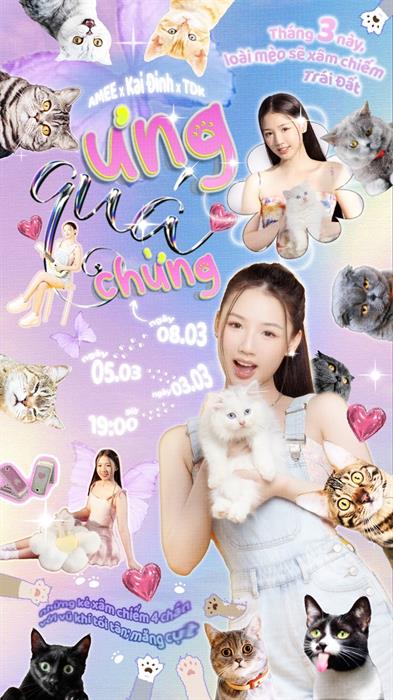 Tintuc - Tối ngày 01/03, AMEE bất ngờ tung poster “nhá hàng” cho một dự án mới mang tên Ưng Quá Chừng. Dự án mở màn năm 2023 của AMEE sở hữu “giao diện” cực đáng yêu với rất nhiều chú mèo vây quanh, nữ ca sĩ xuất hiện ở vị trí trung tâm cùng tạo hình trẻ trung, gần gũi. Lịch trình comeback của mình sẽ có 3 cột mốc chính vào lúc 19:00 các ngày 03/03, 05/03 và 08/03.