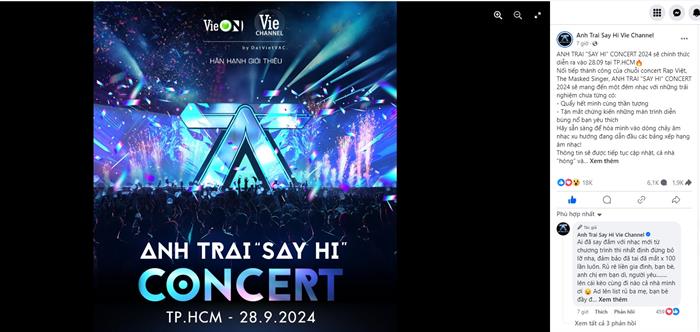 Chỉ 30 phút ngay sau khi thông tin Anh Trai “Say Hi” Concert 2024 công bố sẽ chính thức diễn ra vào ngày 28/09 tại TP.HCM, fanpage chương trình đã thu hút hàng trăm ngàn lượt tương tác phản hồi từ fan. Anh Trai “Say Hi” Concert 2024 không chỉ nhận sự đón nhận nồng nhiệt từ fan của chương trình, mà các khán giả tại Hà Nội, Đà Nẵng và các tỉnh thành trên cả nước cũng không thể giấu được niềm phấn khích khi sắp được cùng với 30 Anh Trai “quẩy” hết mình với những bản hit đang dẫn đầu các bảng xếp hạng âm nhạc trong và ngoài nước, và tận mắt chứng kiến những màn trình diễn bùng nổ của dàn Anh Trai trên sân khấu hoành tráng.